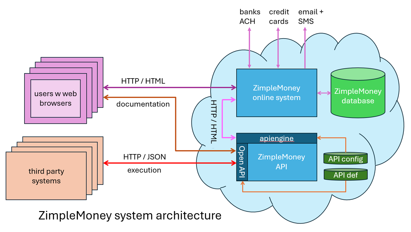 In this diagram, web users are represented by the purple boxes at left, accessing the ZimpleMoney online system (purple arrow). The system has a database (green drum) and interfaces to the outside world - banks, credit cards, emails + SMS - as shown by the purple arrows extending up.